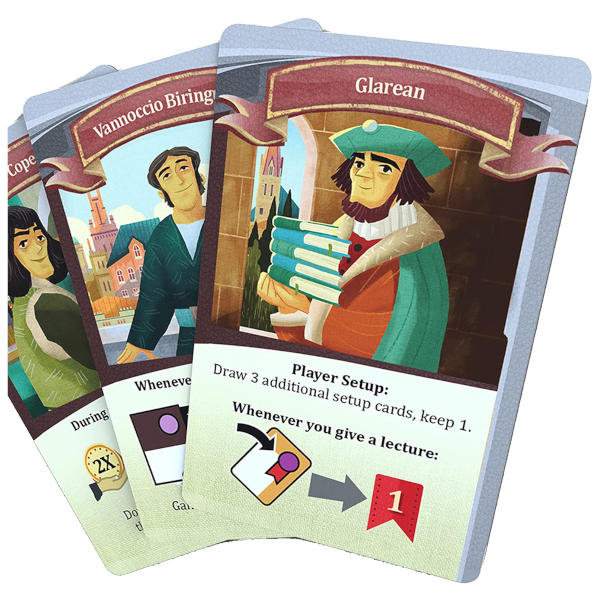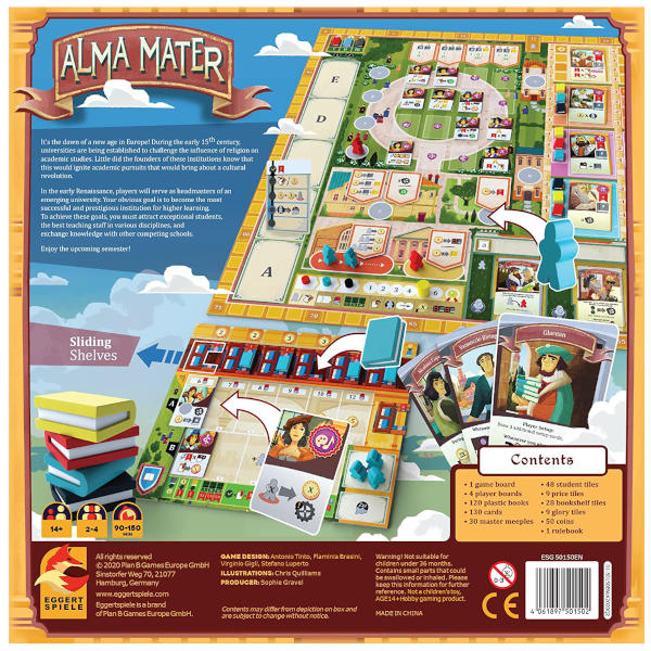 The Alma Mater Board Game has players serving as a headmaster of one of the independent universities in the 15th century. Players seek to strengthen their school’s reputation and standing. To achieve these goals, players need to recruit the best staff and students, exchange knowledge with other schools, and become experts in the school’s four disciplines!