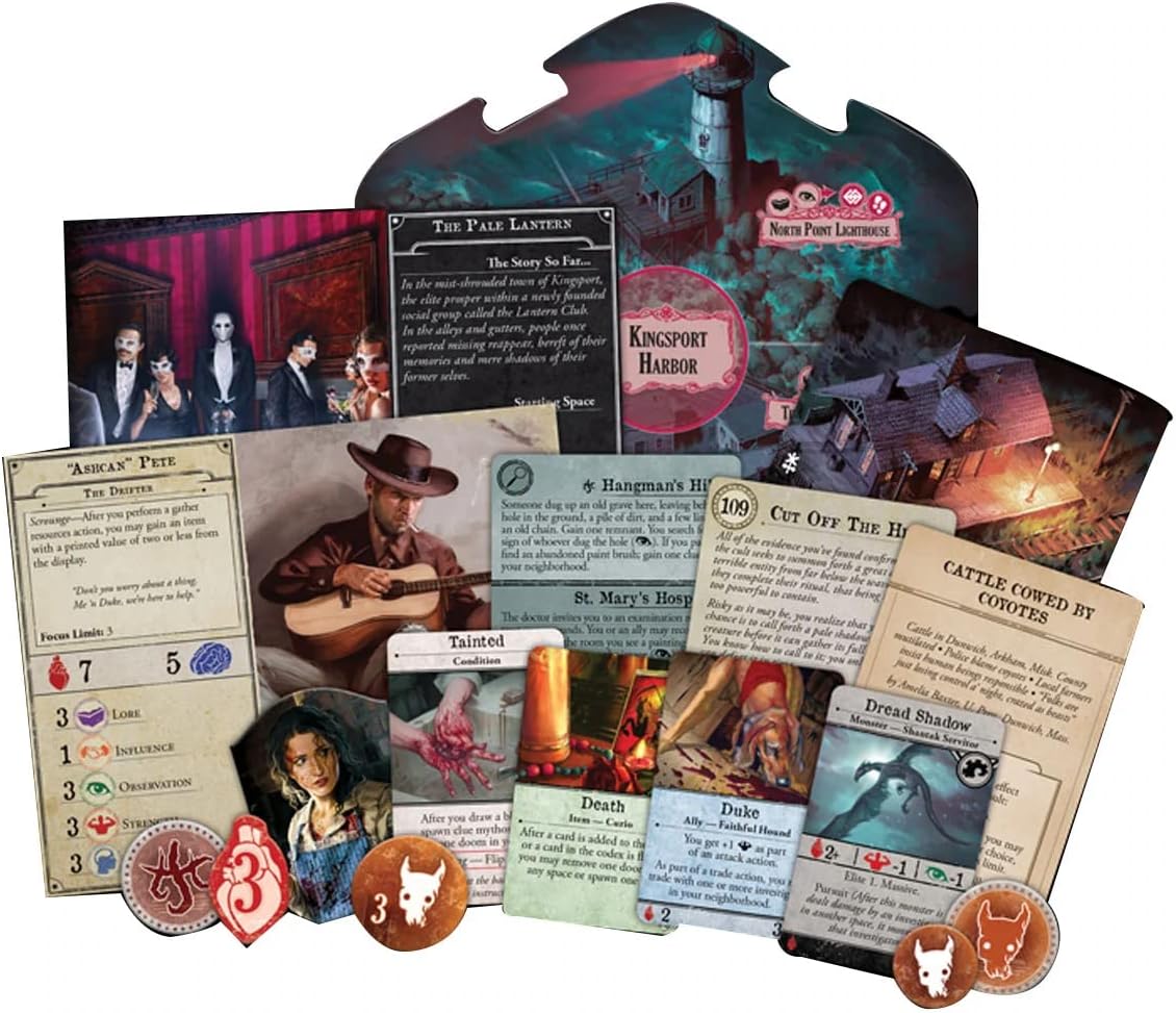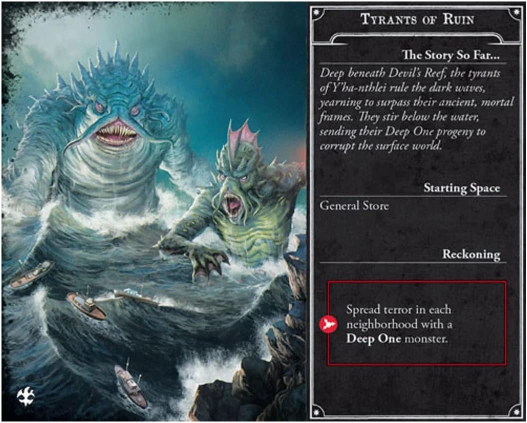 Under Dark Waves is a new large box expansion for Arkham Horror, taking your investigations beyond the town of Arkham to the other ill-fated towns of Massachusetts. Two new double-sided tiles bring Kingsport and Innsmouth to vibrant life, while eight more investigators arrive to join your party, ranging from a drifter like “Ashcan” Pete to a letter carrier such as Stella Clark. These investigators will have their work cut out for them with four entirely new scenarios pitting them against the horrors that lurk beneath the ocean waves. With over 150 encounter and event cards, alongside new assets, monsters, conditions, and the terror mechanic, Under Dark Waves boasts a vast undersea treasure trove, pulling you into some of the Cthulhu Mythos’s most compelling tales.