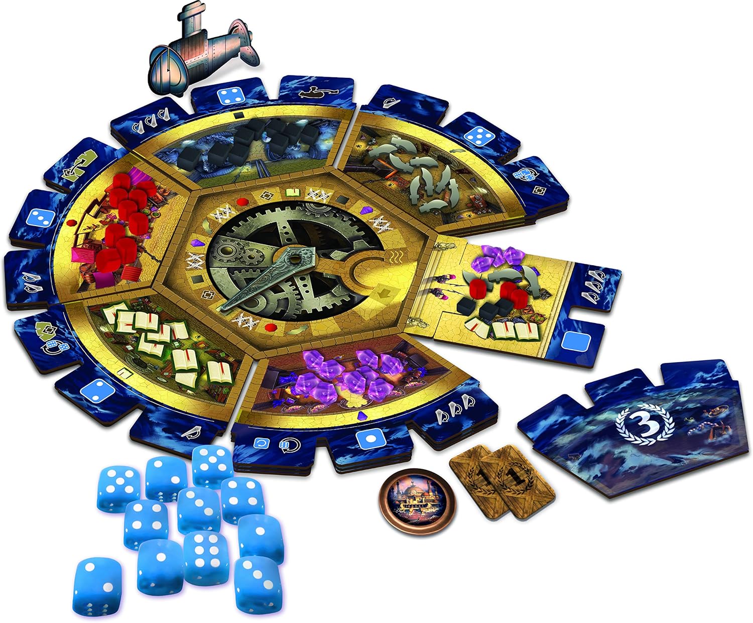 n one day and night, the Island of Atlantis has been overwhelmed beneath the sea. The greater city of Atlantis is about to sink. You, as the last atlanteans, have to save as much wealth as possible before you keep the Fury of the elements. The clock in the center of the city shows the remaining time before the end. But because of the Cataclysm, the gates between the locations are broken down. They open and close randomly. Collecting goods will not be so easy...the mechanics are unique, but simple. On their turn, a player chooses one of the available dice, which is, in fact, a gate. This gate brings the player to a location; in this location there are randomly distributed resources and effects. The effects are randomly dispatched with tiles at the beginning of the game, so that each game will be different! effects can help the player or can interfere with other players’ plans...
